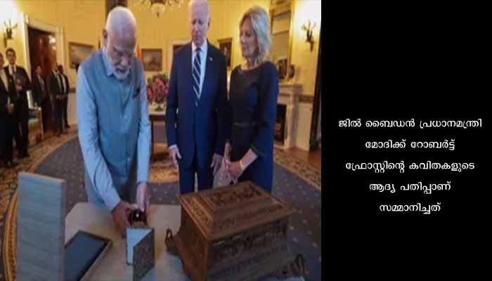 ജിൽ ബൈഡൻ പ്രധാനമന്ത്രി മോദിക്ക് റോബർട്ട് ഫ്രോസ്റ്റിന്റെ കവിതകളുടെ ആദ്യ പതിപ്പാണ് സമ്മാനിച്ചത്. ചന്ദനത്തിൽ കൈകൊണ്ട് നിർമിച്ച പെട്ടിയാണ് മോദി ബൈഡന് സമ്മാനമായി നൽകിയത്. 7.5 ക്യാരറ്റ് ഡയമണ്ട് ജിൽ ബൈഡനും നൽകി. ഗണപതിയുടെ വെള്ളിയിൽ തീർത്ത ചെറു വിഗ്രഹം ഉൾപ്പെടെയാണ് ബൈഡന് ചന്ദനപ്പെട്ടി സമ്മാനിച്ചത്. നവംബറിൽ 81 വയസ്സ് പൂർത്തിയാകുന്ന ബൈഡന് ദസ് ധനവും മോദി നൽകി. ആയിരം പൂർണ ചന്ദ്രന്മാരെ കാണുന്നവർക്കാണ് ദസ് ധനം നൽകുക.