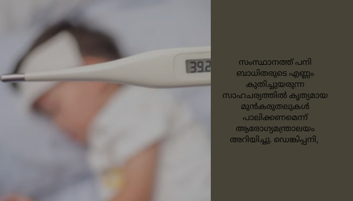 സംസ്ഥാനത്ത് പനി ബാധിതരുടെ എണ്ണം കുതിച്ചുയരുന്ന സാഹചര്യത്തിൽ കൃത്യമായ മുൻകരുതലുകൾ പാലിക്കണമെന്ന് ആരോഗ്യമന്ത്രാലയം അറിയിച്ചു. ഡെങ്കിപ്പനി, എലിപ്പനി തുടങ്ങിയ മാരകവും വ്യാപനശേഷി കൂടിയതുമായ പനികൾ ആശങ്ക ഉയർത്തുന്നുണ്ട്. മലപ്പുറത്ത് കഴിഞ്ഞ ദിവസം റിപ്പോർട്ടു ചെയ്ത എച്ച്1എൻ1 ബാധിച്ചുള്ള മരണവും ആശങ്ക ഉയർത്തുന്നുണ്ട്.