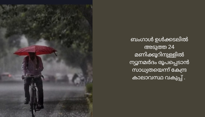 തിരുവനന്തപുരം: ബംഗാൾ ഉൾക്കടലിൽ അടുത്ത 24 മണിക്കൂറിനുള്ളിൽ ന്യൂനമർദം രൂപപ്പെടാൻ സാധ്യതയെന്ന് കേന്ദ്ര കാലാവസ്ഥ വകുപ്പ് . അടുത്ത 3 മണിക്കൂറിൽ കേരളത്തിലെ പത്തനംതിട്ട, ഇടുക്കി, എറണാകുളം, കോഴിക്കോട്, വയനാട്, കണ്ണൂർ എന്നീ ജില്ലകളിൽ ഒറ്റപ്പെട്ടയിടങ്ങളിൽ നേരിയ മഴയ്ക്ക് സാധ്യതയുണ്ടെന്നും കേന്ദ്ര കാലാവസ്ഥ വകുപ്പ് അറിയിച്ചു.