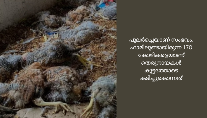 പുലർച്ചെയാണ് സംഭവം. ഫാമിലുണ്ടായിരുന്ന 170 കോഴികളെയാണ് തെരുനായകൾ കൂട്ടത്തോടെ കടിച്ചുകൊന്നത്. നിരവധി കോഴികൾക്ക് പരിക്കേൽക്കുകയും ചെയ്തു. കോഴികളെ വളർത്തുന്ന ഷെഡിന്റെ ഗ്രില്ല് തകർത്ത് അകത്തു കടന്നാണ് നായ്ക്കൾ ആക്രമിച്ചത്.
