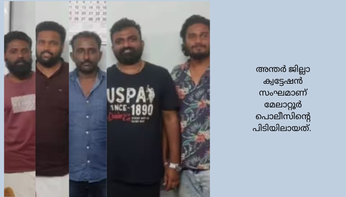 മലപ്പുറം: മേലാറ്റൂരിൽ യുവാവിനെ തട്ടിക്കൊണ്ടുപോയ ക്വട്ടേഷൻ സംഘത്തെ പിന്തുടർന്ന് പിടികൂടി പൊലീസ്. അന്തർ ജില്ലാ ക്വട്ടേഷൻ സംഘമാണ് മേലാറ്റൂർ പൊലീസിന്റെ പിടിയിലായത്. സാമ്പത്തിക ഇടപാടുമായി ബന്ധപ്പെട്ട് മേലാറ്റൂർ സ്വദേശിയെ ക്വട്ടേഷൻ സംഘം 2023 ജൂൺ 25 ഞായറാഴ്ച ഉച്ചയോടെ മേലാറ്റൂരിലെ വീടിന് മുമ്പിൽ നിന്നും ബലമായി വാഹനത്തിൽ കയറ്റി ഗൂഢല്ലൂരിലേക്ക് തട്ടിക്കൊണ്ടു പോവുകയായിരുന്നു. തൊടികപുലം പോരൂർ സ്വദേശികളായ നീലങ്ങാടൻ ജാഫർ, പുല്ലാണി പൂങ്കയിൽ ഷാ മസൂദ്, മുട്ടത്തിൽ ഉണ്ണി ജമാൽ, ആലപ്പുഴ തൃക്കന്നുപുഴ സ്വദേശികളായ നിർമൽ മാധവ്, അനീസ് വഹാബ് എന്നിവരെയാണ് അറസ്റ്റ് ചെയ്തത്.