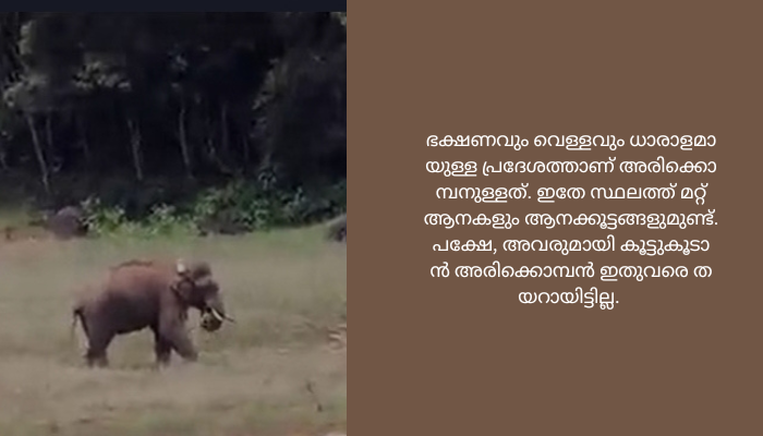 ഭക്ഷണവും വെള്ളവും ധാരാളമായുള്ള പ്രദേശത്താണ് അരിക്കൊമ്പനുള്ളത്. ഇതേ സ്ഥലത്ത് മറ്റ് ആനകളും ആനക്കൂട്ടങ്ങളുമുണ്ട്. പക്ഷേ, അവരുമായി കൂട്ടുകൂടാൻ അരിക്കൊമ്പന് ഇതുവരെ തയറായിട്ടില്ല. മറ്റ് ആനകളുമായി പ്രശ്നങ്ങളുമുണ്ടായിട്ടില്ല. തുമ്പിക്കൈയിലുണ്ടായിരുന്ന പരുക്ക് ഉണങ്ങിയെന്നാണു വനം വാച്ചര്മാര് പറയുന്നത്. കാലിനുണ്ടായിരുന്ന പരുക്കും ഭേദമായി എന്നാണു വിലയിരുത്തൽ.