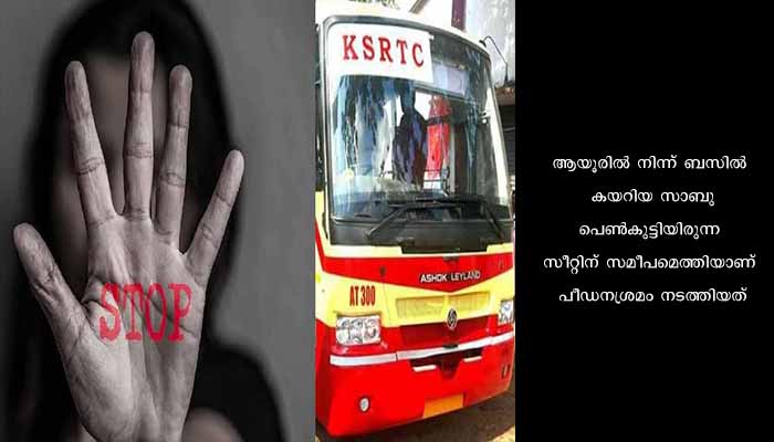 ആയൂരിൽ നിന്ന് ബസിൽ കയറിയ സാബു പെൺകുട്ടിയിരുന്ന സീറ്റിന് സമീപമെത്തിയാണ് പീഡനശ്രമം നടത്തിയത്. ഉറങ്ങുകയായിരുന്ന പെൺകുട്ടി ഞെട്ടി ഉണർന്ന് ബഹളം വച്ചതോടെയാണ് യാത്രക്കാർ ഇയാളെ തടഞ്ഞുവച്ചത്. തുടർന്ന് ചടയമംഗലം പൊലീസ് സ്ഥലത്ത് എത്തി ബസ് ചടയമംഗലം സ്റ്റേഷനിലേക്ക് മാറ്റുകയും സാബുവിനെ കസ്റ്റഡിയിലെടുക്കുകയുമായിരുന്നു.