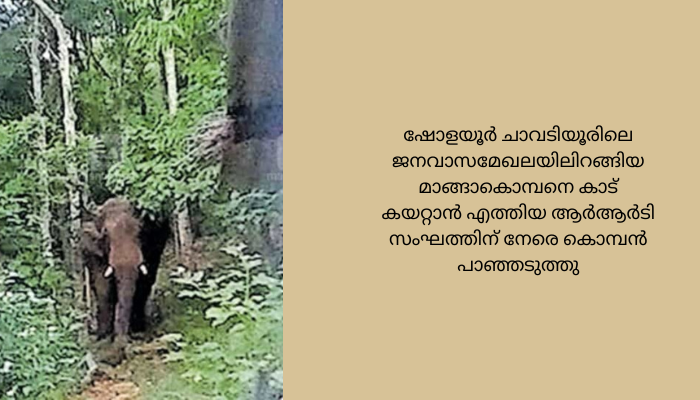 ഷോളയൂർ ചാവടിയൂരിലെ ജനവാസമേഖലയിലിറങ്ങിയ മാങ്ങാകൊമ്പനെ കാട് കയറ്റാൻ എത്തിയ ആർആർടി സംഘത്തിന് നേരെ കൊമ്പൻ പാഞ്ഞടുത്തു. ഏറെ പ്രയാസപ്പെട്ടാണ് ഒറ്റയാനെ കാടുകയറ്റിയത്.