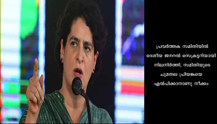 ഹിമാചൽ, കർണാടക നിയമസഭാ തിരഞ്ഞെടുപ്പ് വിജയങ്ങളിൽ പ്രധാന പങ്കുവഹിച്ച പ്രിയങ്കയ്ക്ക്, ഇനിയുള്ള തിരഞ്ഞെടുപ്പുകളിൽ പാർട്ടിയുടെ തന്ത്രരൂപീകരണം, പ്രചാരണം എന്നിവയ്ക്കായുള്ള സമിതിയുടെ ചുമതല നൽകുന്നത് ഹൈക്കമാൻഡിന്റെ പരിഗണനയിലുണ്ട്. പ്രവർത്തക സമിതിയിൽ ദേശീയ ജനറൽ സെക്രട്ടറിയായി നിലനിർത്തി, സമിതിയുടെ ചുമതല പ്രിയങ്കയെ ഏൽപിക്കാനാണു നീക്കം.