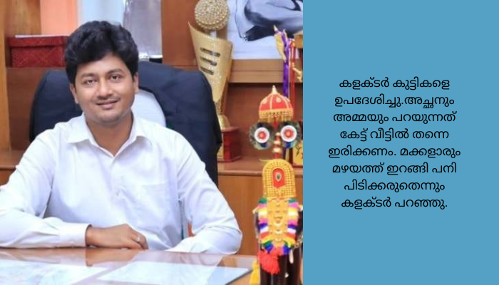 ജില്ലയിൽ മ‍ഴ കനത്ത സാഹചാര്യത്തിൽ 2022ജലൈ 5 ബുധനാ‍ഴ്ച അവധി പ്രഖ്യാപിക്കുമ്പോ‍ഴാണ് തൃശൂർ കളക്ടർ വി.ആർ കൃഷ്ണതേജ കുട്ടികളെ ഉപദേശിച്ച് രംഗത്തെത്തിയത്. അവധിയാണെന്ന് കരുതി കുട്ടികളാരും തന്നെ മഴയത്ത് കളിക്കാനോ വെള്ളത്തിൽ ഇറങ്ങാനോ ഒന്നും നിക്കരുതെന്നും പുഴയിലൊക്കെ വെള്ളം കൂടുതലാണെന്നും കളക്ടർ കുട്ടികളെ ഉപദേശിച്ചു.അച്ഛനും അമ്മയും പറയുന്നത് കേട്ട് വീട്ടിൽ തന്നെ ഇരിക്കണം. മക്കളാരും മഴയത്ത് ഇറങ്ങി പനി പിടിക്കരുതെന്നും കളക്ടർ പറഞ്ഞു.