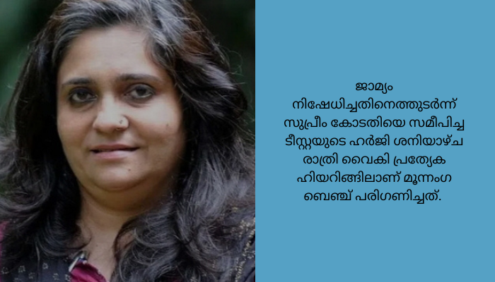 ജാമ്യം നിഷേധിച്ചതിനെത്തുടർന്ന് സുപ്രീം കോടതിയെ സമീപിച്ച ടീസ്റ്റയുടെ ഹർജി ശനിയാഴ്ച രാത്രി വൈകി പ്രത്യേക ഹിയറിങ്ങിലാണ് മൂന്നംഗ ബെഞ്ച് പരിഗണിച്ചത്. ഹൈക്കോടതി ഉത്തരവിനെ ചോദ്യംചെയ്ത് ഹർജി നൽകാൻ എന്തുകൊണ്ട് ടിസ്റ്റയ്ക്ക് സമയം നൽകിയില്ലെന്നും സുപ്രീംകോടതി ചോദിച്ചു.