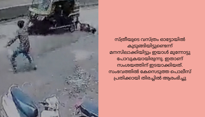 ഓട്ടോയുടെ പിന്നാലെ വരുന്ന ബൈക്ക് യാത്രികൻ വാഹനം നിർത്താൻ ആവശ്യപ്പെടുന്നുണ്ടെങ്കിലും ഡ്രൈവർ നിർത്താൻ തയാറാവാത്തതും വീഡിയോയിൽ കാണാം. സ്ത്രീയുടെ വസ്ത്രം ഓട്ടോയിൽ കുടുങ്ങിയിട്ടുണ്ടെന്ന് മനസിലാക്കിയിട്ടും ഇയാൾ മുന്നോട്ടു പോവുകയായിരുന്നു. ഇതാണ് സംശയത്തിന് ഇടയാക്കിയത്. സംഭവത്തിൽ കേസെടുത്ത പൊലീസ് പ്രതിക്കായി തിരച്ചിൽ ആരംഭിച്ചു