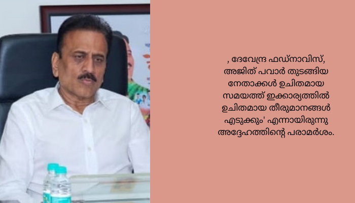 “നിരവധി നേതാക്കൾ തങ്ങളുമായി ബന്ധത്തിലാണെന്നും ഏകനാഥ് ഷിൻഡെ, ദേവേന്ദ്ര ഫഡ്നാവിസ്, അജിത് പവാർ തുടങ്ങിയ നേതാക്കൾ ഉചിതമായ സമയത്ത് ഇക്കാര്യത്തിൽ ഉചിതമായ തീരുമാനങ്ങൾ എടുക്കും’ എന്നായിരുന്നു അദ്ദേഹത്തിന്റെ പരാമർശം.