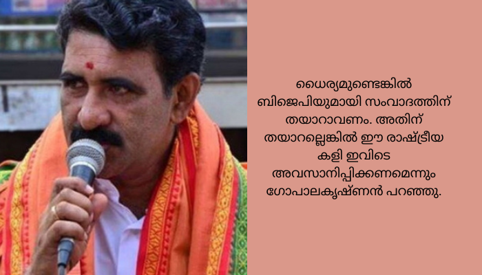 എല്ലാവർക്കും തുല്യ നീതി ലഭിക്കാൻ ഭരണഘടനാപരമായ ദൗത്യം നിർവ്വഹിക്കാൻ ബിജെപി ശ്രമിക്കുമ്പോൾ സമൂഹത്തിൽ ഭിന്നത സൃഷ്ടിക്കാനാണ് സിപിഎം ശ്രമിക്കുന്നത്. നീതിക്ക് ജാതിയും മതവും ഇല്ലെന്നല്ലേ. തുല്യനീതി ഉറപ്പാക്കാൻ ചുംബന സമരവുമായി തെരുവിലിറങ്ങിയവർ മന്ത്രി സഭയിലുള്ളപ്പോൾ തുല്യ നീതി വിഭാവനം ചെയ്യുന്ന പൊതു നിയമത്തെ എതിർക്കുന്നത് അപലീയമാണ്. സിപിഎമ്മിന് ധൈര്യമുണ്ടെങ്കിൽ ബിജെപിയുമായി സംവാദത്തിന് തയാറാവണം. അതിന് തയാറല്ലെങ്കിൽ ഈ രാഷ്ട്രീയ കളി ഇവിടെ അവസാനിപ്പിക്കണമെന്നും ഗോപാലകൃഷ്ണൻ പറഞ്ഞു.