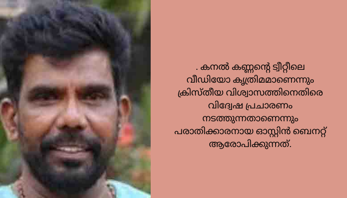ഒരു മത വിഭാഗത്തിനെതിരെ വ്യാജ പ്രചരണം നടത്തിയതിനാണ് കേസ്. ഡിഎംകെ പ്രവര്ത്തകന്റെ പരാതിയിലാണ് നടപടി. ട്വിറ്ററിലായിരുന്നു കനല് കണ്ണന് വിവാദ പരാമര്ശം നടത്തിയത്. കനല് കണ്ണന്റെ ട്വീറ്റീലെ വീഡിയോ കൃത്രിമമാണെന്നും ക്രിസ്തീയ വിശ്വാസത്തിനെതിരെ വിദ്വേഷ പ്രചാരണം നടത്തുന്നതാണെന്നും പരാതിക്കാരനായ ഓസ്റ്റിന് ബെനറ്റ് ആരോപിക്കുന്നത്.