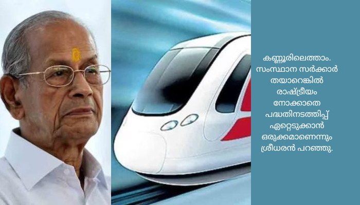തുരങ്കപാതയും എലവേറ്റഡ് പാതയും ചേർന്ന പദ്ധതിയാണ് കേരളത്തിൽ പ്രായോഗികം. ഇത് പൂർത്തിയായാൽ തിരുവനന്തപുരത്തുനിന്ന് 1 മണിക്കൂർ 8 മിനിറ്റ് കൊണ്ട് കണ്ണൂരിലെത്താം. സംസ്ഥാന സർക്കാർ തയാറെങ്കിൽ രാഷ്ട്രീയം നോക്കാതെ പദ്ധതിനടത്തിപ്പ് ഏറ്റെടുക്കാൻ ഒരുക്കമാണെന്നും ശ്രീധരൻ പറഞ്ഞു.
