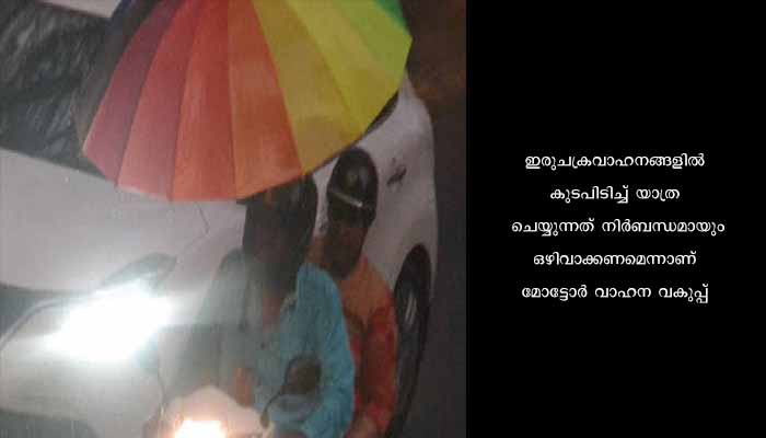 ഇരുചക്രവാഹനങ്ങളിൽ കുടപിടിച്ച് യാത്ര ചെയ്യുന്നത് നിർബന്ധമായും ഒഴിവാക്കണമെന്നാണ് മോട്ടോർ വാഹന വകുപ്പ്. വായു കടക്കാത്ത മഴക്കോട്ടും അയഞ്ഞ വസത്രങ്ങളോ പോലും വാഹനത്തിന്റെ ഗതിമാറ്റും എന്നിരിക്കെ കുട പിടിക്കുന്നത് പാരച്ച്യൂട്ട് എഫക്ടിറ്റിന് സാധ്യത വർദ്ധിപ്പിക്കും. വാഹനം സഞ്ചരിക്കുന്നതിന്റെ എതിർ ദിശയിലാണ് കാറ്റടിക്കുന്നതെങ്കിൽ വാഹനത്തിന്റെ വേഗവും കാറ്റിന്റെ വേഗതയും കുടയിൽ അനുഭവപ്പെടും. കുടയുടെ വലിപ്പം കൂടുന്നതിന് അനുസരിച്ച് ഇത് സൃഷ്ടിക്കുന്ന മർദ്ദവും കൂടാറുണ്ട്. വാഹനത്തിൽ സഞ്ചരിക്കുമ്പോൾ കുട പിടിക്കുന്നതിനാൽ :-
