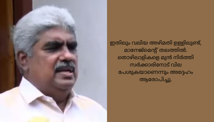 ബാങ്കുകൾക്ക് നൽകിയ കത്ത് ജനാധിപത്യ വിരുദ്ധമാണ്. യൂണിയൻ ഫണ്ട് പിരിക്കുക തന്നെ ചെയ്യും. സമാന്തര പ്രവർത്തനം നടത്തുന്നു എന്നത് ശരിയല്ല. വാക്കുകളിൽ തന്നെ പൊള്ളത്തരമാണ് ഇത്. ട്രേഡ് യൂണിയനിൽ കുറ്റം ചാർത്തേണ്ട സാഹചര്യം ഇല്ല. ഇത്രയും ധനകാര്യ സാഹായം നൽകിയ ഏത് ഗവൺമെന്റാണ് വേറെയുള്ളത്. എല്ലാ മാസവും 50 കോടി നൽകുമെന്ന് പറഞ്ഞത് മുഖ്യമന്ത്രിയാണ്. നടപ്പാക്കിയില്ലെങ്കിൽ പരിശോധിക്കണം. ഉന്നത ഉദ്യോഗസ്ഥ തലത്ത് അഴിമതി തുടരുന്നുണ്ട്. ഇതിലും വലിയ അഴിമതി ഉള്ളിലുണ്ട്, മാനേജ്മെന്റ് തലത്തിൽ. തൊഴിലാളികളെ മുൻ നിർത്തി സർക്കാരിനോട് വില പേശുകയാണെന്നും അദ്ദേഹം ആരോപിച്ചു.