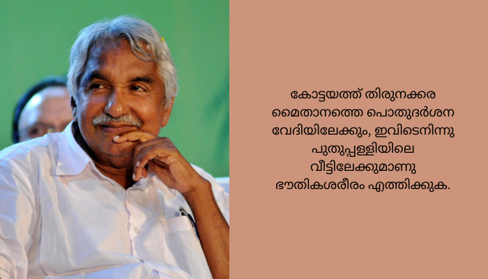 തിരുവനന്തപുരം : ∙ മുതിർന്ന കോൺഗ്രസ് നേതാവും മുൻ മുൻമുഖ്യമന്ത്രിയുമായ ഉമ്മൻ ചാണ്ടിയുടെ ഭൗതികദേഹം വഹിച്ചുകൊണ്ടുള്ള വിലാപയാത്ര 2023 ജൂലൈ 19 ബുധനാഴ്ച രാവിലെ ഏഴിന് ജഗതിയിലെ പുതുപ്പള്ളി ഹൗസിൽനിന്നും കോട്ടയത്തേക്ക് പുറപ്പെടും. കോട്ടയത്തേക്കുള്ള ഉമ്മൻ ചാണ്ടിയുടെ അന്ത്യ യാത്രയ്ക്കുള്ള വാഹനം കെഎസ്ആർടിസി തയാറാക്കി. പാപ്പനംകോട് ഡിപ്പോ സെൻട്രൽ വർക്ക്സിലെ JN 336 എന്ന എസി ലോ ഫ്ലോർ ജൻറം ബസാണ് ഇതിനായി തിരഞ്ഞെടുത്തിരിക്കുന്നത്. തിരുവനന്തപുരത്തുനിന്ന് കോഴിക്കോട്ടേക്ക് സർവീസ് നടത്തുന്ന ബസാണ് ഇത്.