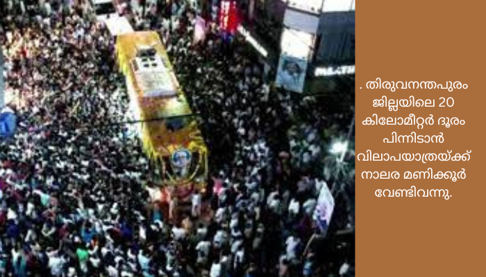 സമാനതകളില്ലാത്ത ഒരു അന്ത്യയാത്രാമൊഴിക്കാണ് കേരളം സാക്ഷ്യം വഹിക്കുന്നത്. ഉമ്മൻചാണ്ടി എന്ന മുൻ മുഖ്യമന്ത്രിയെ, തങ്ങളുടെ ജനകീയനായ നേതാവിനെ കേരളം എത്ര കണ്ട് ആദരിച്ചിരുന്നു, സ്നേഹിച്ചിരുന്നു, എന്നത് വ്യക്തമാകുന്നതാണ് വഴിനീളെ തടിച്ച് കൂടിയ ജനക്കൂട്ടത്തിൻറെ കാഴ്ച. അടൂരും കൊട്ടാരക്കരയിലും ഏനാത്തും വികാര നിർഭരമായ രംഗങ്ങളിലൂടെയാണ് വിലാപയാത്ര കടന്നുപോയത്. തിരുവനന്തപുരം ജില്ലയിലെ 20 കിലോമീറ്റർ ദൂരം പിന്നിടാൻ വിലാപയാത്രയ്ക്ക് നാലര മണിക്കൂർ വേണ്ടിവന്നു.