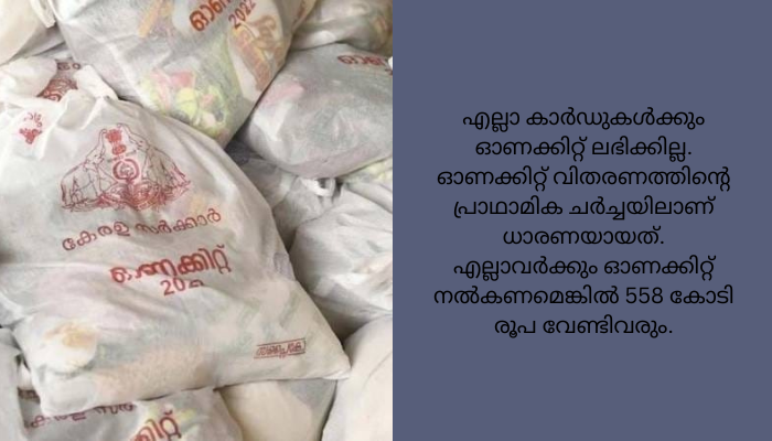 കഴിഞ്ഞവർഷം 90 ലക്ഷം കാർഡുടമകൾക്ക് ഓണക്കിറ്റ് തയ്യാറാക്കി വിതരണം ചെയ്തപ്പോൾ സർക്കാരിന് 500 കോടി രൂപയാണു ചെലവായത്. എന്നാൽ ഇത്തവണ കാർഡുടമകളുടെ എണ്ണം 93.76 ലക്ഷത്തിലേക്ക് ഉയർന്നു. മുൻകാലങ്ങളിൽ എല്ലാവിഭാഗങ്ങൾക്കും ഓണക്കിറ്റുനൽകിയത് കോവിഡുൾപ്പെടെയുള്ള പ്രത്യേക സാഹചര്യം കണക്കിലെടുത്താണ്
