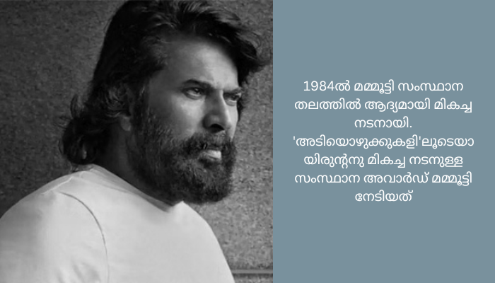 ആദ്യമായി മമ്മൂട്ടി സംസ്ഥാന ചലച്ചിത്ര അവാര്ഡ് നേടുന്റനത് 1981ലാണ്. ‘അഹിംസ’യിലൂടെ രണ്ടാമത്തെ മികച്ച നടനുള്ള അവാര്ഡാണ് മമ്മൂട്ടിക്ക് ലഭിച്ചത്. 1984ല് മമ്മൂട്ടി സംസ്ഥാന തലത്തില് ആദ്യമായി മികച്ച നടനായി. ‘അടിയൊഴുക്കുകളി’ലൂടെയായിരുന്റനു മികച്ച നടനുള്ള സംസ്ഥാന അവാര്ഡ് മമ്മൂട്ടി നേടിയത്