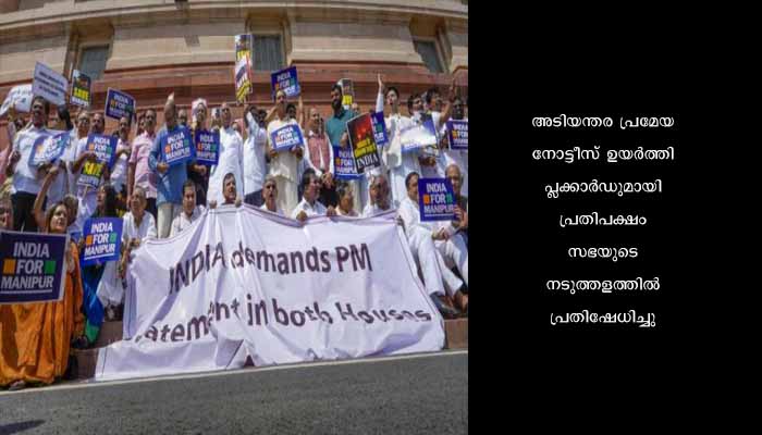അടിയന്തര പ്രമേയ നോട്ടീസ് ഉയര്ത്തി പ്ലക്കാര്ഡുമായി പ്രതിപക്ഷം സഭയുടെ നടുത്തളത്തില് പ്രതിഷേധിച്ചു. പ്രധാനമന്ത്രി മറുപടി പറയണമെന്നെവശ്യപ്പെട്ടായിരുന്നു പ്രതിഷേധം. പ്രതിഷേധത്തെത്തുടര്ന്ന് രാജ്യസഭയും ലോകസഭയും നിര്ത്തിവെച്ചിരുന്നു.