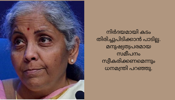 ന്യൂഡൽഹി: വായ്പകൾ തിരിച്ചുപിടിക്കാനുള്ള നടപടികൾ നിഷ്ഠുരമാകാൻ പാടില്ലെന്ന് പൊതുമേഖലാ ബാങ്കുകൾക്കും സ്വകാര്യ ബാങ്കുകൾക്കും സർക്കാർ നിർദേശം നൽകിയിട്ടുണ്ടെന്ന് കേന്ദ്ര ധനമന്ത്രി നിർമല സീതാരാമൻ.