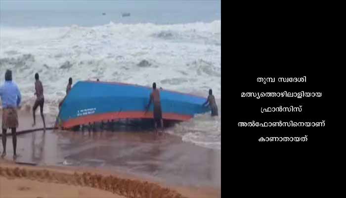 തിരുവനന്തപുരം തുമ്പയിലും രാവിലെയാണ് വള്ളം മറിഞ്ഞ് അപകടം ഉണ്ടായത്. തുമ്പ സ്വദേശി മത്സ്യത്തൊഴിലാളിയായ ഫ്രാൻസിസ് അൽഫോൺസിനെയാണ് കാണാതായത്. 65 വയസുള്ള ഫ്രാൻസിസിനായി തിരച്ചിൽ തുടരുകയാണ്. നാല് പേരാണ് അപകടം നടക്കുമ്പോൾ വള്ളത്തിലുണ്ടായത്. ഇവരിൽ ഫ്രാൻസിസ് ഒഴികെ മറ്റ് നാല് പേർക്കും നീന്തി കരയിലേക്ക് എത്താൻ സാധിച്ചു.