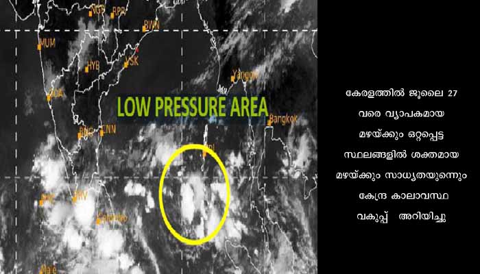 ന്യൂനമര്ദം വടക്കന് ആന്ധ്രാപ്രദേശ്- തെക്കന് ഒഡിഷ തീരത്തേക്കു നീങ്ങാന് സാധ്യതയുണ്ട്. വടക്കുപടിഞ്ഞാറന് മധ്യപ്രദേശിന് മുകളില് ചക്രവാതച്ചുഴി സ്ഥിതിചെയ്യുന്നുണ്ട്. കച്ചിന് മുകളില് മറ്റൊരു ചക്രവാതച്ചുഴിയും നിലനില്ക്കുന്നുണ്ട്. കേരളത്തില് ജൂലൈ 27 വരെ വ്യാപകമായ മഴയ്ക്കും ഒറ്റപ്പെട്ട സ്ഥലങ്ങളില് ശക്തമായ മഴയ്ക്കും സാധ്യതയുണ്ടെന്നും കേന്ദ്ര കാലാവസ്ഥവകുപ്പ് അറിയിച്ചു.