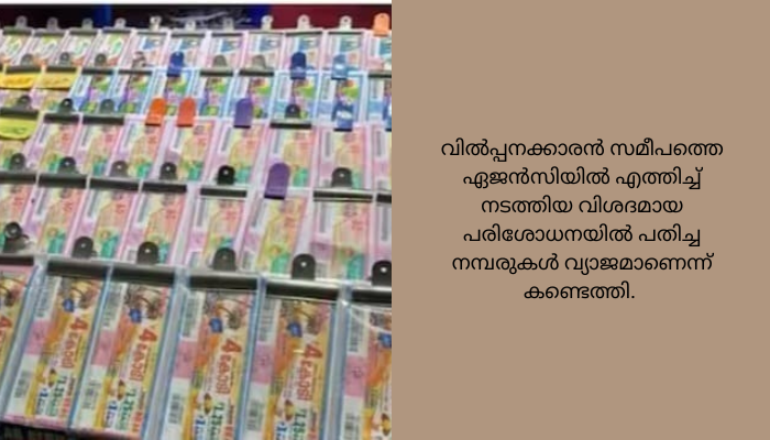 ബൈക്കിലെത്തിയ ആൾ 5000 രൂപ സമ്മാനാർഹമായ നമ്പർ പതിച്ച നാല് ടിക്കറ്റുകൾ വിൽപ്പനക്കാരന് നൽകി പണം വാങ്ങി കടന്നു കളയുകയായിരുന്നു. വിൽപ്പനക്കാരൻ സമീപത്തെ ഏജൻസിയിൽ എത്തിച്ച് നടത്തിയ വിശദമായ പരിശോധനയിൽ പതിച്ച നമ്പരുകൾ വ്യാജമാണെന്ന് കണ്ടെത്തി. നിലവിലുള്ള നമ്പരിന് മുകളിൽ സമ്മാനാർഹമായ നമ്പർ പതിച്ചാണ് തട്ടിപ്പ് നടത്തിയത്. ഹരിദാസ് ചേർത്തല പൊലീസിൽ പരാതി നൽകി