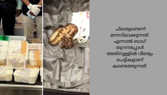 ഈ കഴിഞ്ഞ ഞായറാഴ്ചയാണ് ട്രിച്ചി അന്താരാഷ്ട്ര വിമാനത്താവളത്തിൽ കസ്റ്റംസ് ഉദ്യോഗസ്ഥരുടെ പരിശോധനയ്ക്കിടെ ഒരു യാത്രക്കാരന്റെ ട്രോളി ബാഗിൽ നിന്ന് 47 പാമ്പുകളും 2 പല്ലികളും പിടിച്ചെടുത്തത്. ക്വാലാലംപൂരിൽ നിന്ന് എത്തിയ മുഹമ്മദ് മൊയ്തീൻ എന്ന യാത്രക്കാരനെയാണ് പരിശോധനയിൽ കുടുങ്ങിയത്. ബാടിക് എയർ വിമാനത്തിൽ ട്രിച്ചി വിമാനത്താവളത്തിൽ ഇറങ്ങിയ യാത്രക്കാരന്റെ ബാഗ് കസ്റ്റംസ് അധികൃതർ പരിശോധിച്ചപ്പോഴാണ് വിചിത്രമായ എന്തോ ചിലതുണ്ടെന്ന് മനസിലാക്കുന്നത്. എന്നാൽ ബാഗ് തുറന്നപ്പോൾ അതിനുള്ളിൽ വീണ്ടും പെട്ടികളാണ് കണ്ടെത്തുന്നത്.