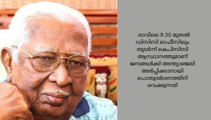 മുതിർന്ന കോൺഗ്രസ് നേതാവ് വക്കം പുരുഷോത്തമന്റെ മൃതദേഹം 2023 ഓഗസ്റ്റ് 1 ന് പൊതുദർശനത്തിന് വെക്കും. രാവിലെ 9.30 മുതൽ ഡിസിസി ഓഫീസിലും തുടർന്ന് കെപിസിസി ആസ്ഥാനത്തുമാണ് ജനങ്ങൾക്ക് അന്ത്യാഞ്ജലി അർപ്പിക്കാനായി പൊതുദർശനത്തിന് വെക്കുന്നത്. 2023 ജൂലൈ 31 തിങ്കളാഴ്ച ഉച്ചയ്ക്ക് ഒന്നരയോടെ കുമാരപുരം പൊതുജനം ലെയ്നിലെ വസതിയിൽ വെച്ചായിരുന്നു അന്തരിച്ചത്. 2023 ഓഗസ്റ്റ് 2 ,10.30ന് വക്കത്തെ കുടുംബവീട്ടു വളപ്പിലാണ് സംസ്കാരം.