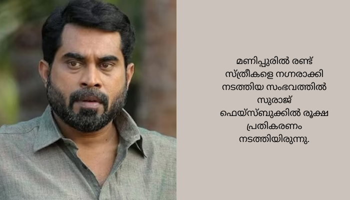 മണിപ്പുരിൽ രണ്ട് സ്ത്രീകളെ നഗ്നരാക്കി നടത്തിയ സംഭവത്തിൽ സുരാജ് ഫെയ്സ്ബുക്കിൽ രൂക്ഷ പ്രതികരണം നടത്തിയിരുന്നു. ‘‘മണിപ്പൂർ അസ്വസ്ഥതയുണ്ടാക്കുന്നു. അപമാനം കൊണ്ടു തല കുനിഞ്ഞുപോകുന്നു. ഇനിയും ഒരു നിമിഷം നീതി വൈകിക്കൂടാ’’– ഇതായിരുന്നു ഫെയിസ്ബുക്കിൽ സുരാജ് പങ്കുവച്ച വരികൾ. …