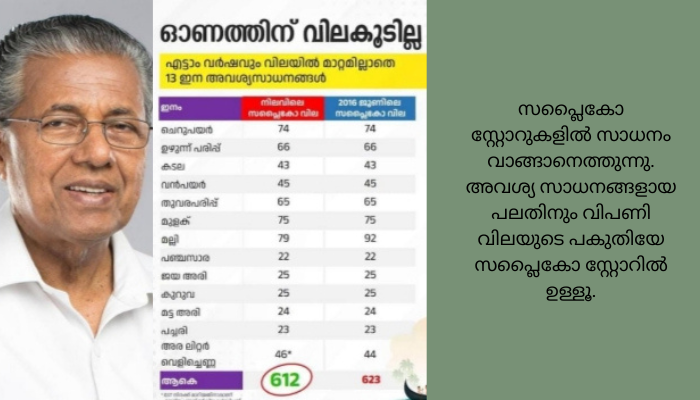 പതിമൂന്നിനം നിത്യോപയോഗ വസ്തുക്കളാണ് 2016 ലെ വിലയിലും കുറച്ച് ഇപ്പോഴും നൽകിവരുന്നത്. സർക്കാരിന് ഓരോ മാസവും 40 കോടി രൂപയുടെ അധികബാധ്യത ഇതുവഴിയുണ്ടാകുന്നുണ്ട്. കേരളത്തിൽ 93 ലക്ഷം പേർക്ക് റേഷൻ കാർഡുകളുണ്ട്. ഇതിൽ 55 ലക്ഷത്തോളം പേർ സപ്ലൈകോ സ്റ്റോറുകളിൽ സാധനം വാങ്ങാനെത്തുന്നു. അവശ്യ സാധനങ്ങളായ പലതിനും വിപണി വിലയുടെ പകുതിയേ സപ്ലൈകോ സ്റ്റോറിൽ ഉള്ളൂ.