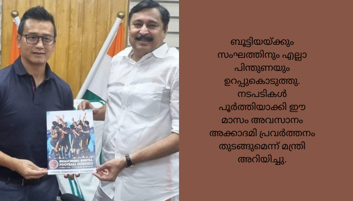 മന്ത്രി അബ്ദുറഹിമാന്റെ കുറിപ്പ്: ഏറ്റവും പ്രിയപ്പെട്ട ഇന്ത്യന് ഫുട്ബോളറാണ് ബെയ്ചുങ്ങ് ബുട്ടിയ. അന്താരാഷ്ട്ര ഫുട്ബോളില് ഇന്ത്യയ്ക്ക് വീണ്ടുമൊരു മേല്വിലാസം ഉണ്ടാക്കിക്കൊടുത്തത് ഈ സിക്കിമുകാരനാണ്. തൊണ്ണൂറുകളുടെ തുടക്കത്തില് കോഴിക്കോട് സേട്ട് നാഗ്ജി ഫുട്ബോള് ടൂര്ണമെന്റില് വെച്ചാണ് ആ കാലുകളുടെ മിടുക്ക് ആദ്യം കാണുന്നത്. ഫുട്ബോളില് ഉയരങ്ങളില് എത്തുമെന്ന് അന്നു തന്നെ തെളിഞ്ഞിരുന്നു. ഇന്ന് ബെയ്ചുങ്ങ് ബുട്ടിയ, പ്രത്യേക ക്ഷണം അനുസരിച്ച് സെക്രട്ടറിയേറ്റിലെ ഓഫീസില് എത്തി കൂടിക്കാഴ്ച നടത്തി. കളിക്കളത്തിലെ ആവേശം ഇന്നും അടങ്ങിയിട്ടില്ല. സംസാരത്തില് ഫുട്ബോള് മാത്രം. ഒരു ഫുട്ബോള് കളിക്കാരന് എന്ന സ്ഥാനത്തുനിന്ന് വിരമിച്ചാല് എങ്ങനെയായിരിക്കണം എന്നതിന് ഇതിലും വലിയ മാതൃകയില്ല. ഫുട്ബോളിനു വേണ്ടി സര്വവും സമര്പ്പിച്ച്, ഇന്ത്യന് ഫുട്ബോളിന്റെ ഉയര്ച്ച മാത്രം സ്വപ്നം കണ്ടു മുന്നോട്ടുപോവുകയാണ്.