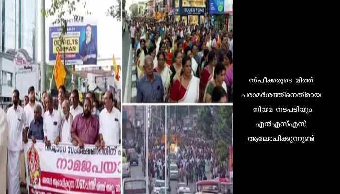 തിരുവനന്തപുരം: മിത്ത് പരാമർശത്തിൽ സ്പീക്കർ എ എൻ ഷംസീറിനെതിരെ എൻഎസ്എസ് തിരുവനന്തപുരത്ത് നടത്തിയ നാമജപയാത്രക്കെതിരെ കേസെടുത്തിൽ എൻഎസ്എസ് ഹൈക്കോടതിയെ സമീപിക്കും. സ്പീക്കരുടെ മിത്ത് പരാമർശത്തിനെതിരായ നിയമ നടപടിയും എൻഎസ്എസ് ആലോചിക്കുന്നുണ്ട്. മിത്തിൽ മുഖ്യമന്ത്രിയുടെ പ്രതികരണമാണ് എൻഎസ്എസ് കാക്കുന്നത്. പക്ഷെ, 03/08/23 വ്യാഴാഴ്ച തിരുവനന്തപുരത്ത് ശാസ്ത്രസാങ്കേതിക വിദ്യയെ കുറിച്ചുള്ള ഒരു പരിപാടിയിൽ പങ്കെടുത്ത മുഖ്യമന്ത്രി വിഷയത്തിൽ തൊടാതെയാണ് പ്രസംഗിച്ചത്.