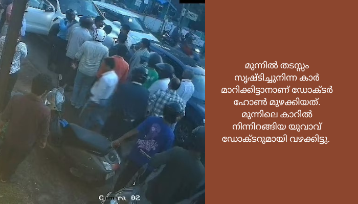 സരോവരം ഭാഗത്തു നിന്നെത്തിയ ഡോക്ടർക്ക് വയനാട് റോഡ് ക്രിസ്ത്യൻ കോളജ് സിഗ്നൽ ജംക്ഷനിൽനിന്ന് ഇടത്തോട്ടാണു പോകേണ്ടിയിരുന്നത്. ഫ്രീ ടേണുള്ള ഇവിടെ മുന്നിൽ തടസ്സം സൃഷ്ടിച്ചുനിന്ന കാർ മാറിക്കിട്ടാനാണ് ഡോക്ടർ ഹോൺ മുഴക്കിയത്. മുന്നിലെ കാറിൽ നിന്നിറങ്ങിയ യുവാവ് ഡോക്ടറുമായി വഴക്കിട്ടു. ഡോക്ടർ നിർത്താതെ ഇയാളുടെ കാർ ഓവർടേക്ക് ചെയ്ത് ഓടിച്ചുപോയി. എന്നാൽ പിന്തുടർന്നെത്തിയ യുവാവ് ഡോക്ടറുടെ കാർ പി.ടി. ഉഷ റോഡ് ജംക്ഷനിലെത്തിയപ്പോൾ മുന്നിൽ കാർ കയറ്റി തടയുകയും ഇറങ്ങിച്ചെന്ന് മർദിക്കുകയുമായിരുന്നു.