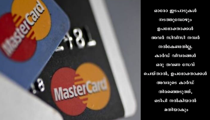 ഡല്ഹി: ഓൺലൈൻ ക്രെഡിറ്റ് കാർഡ് പേയ്മെന്റുകൾ സുഗമമായി നടത്തുന്നതിനുള്ള പുതിയ സംവിധാനവുമായി മാസ്റ്റർകാർഡ്. ഡെബിറ്റ്, ക്രെഡിറ്റ് കാർഡ് ഉടമകൾക്ക് കൂടുതൽ സൗകര്യപ്രദവും സുരക്ഷിതവുമായ സംവിധാനമാണ് മാസ്റ്റർകാർഡ് അവതരിപ്പിച്ചിരിക്കുന്നത്. സാധാരണയായി, ഇടപാടുകൾ പൂർത്തിയാക്കാൻ ഉപഭോക്താക്കൾ പേയ്മെന്റ് കാർഡിന്റെ പിന്നിലുള്ള മൂന്നക്ക നമ്പർ (സിവിസി- ക്രെഡിറ്റ് വെരിഫിക്കേഷൻ കോഡ്) നൽകേണ്ടതുണ്ട്.