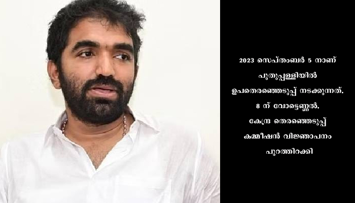 2023 സെപ്തംബർ 5 നാണ് പുതുപ്പള്ളിയിൽ ഉപതെരഞ്ഞെടുപ്പ് നടക്കുന്നത്. 8 ന് വോട്ടെണ്ണൽ. കേന്ദ്ര തെരഞ്ഞെടുപ്പ് കമ്മീഷൻ വിജ്ഞാപനം പുറത്തിറക്കി. മാതൃകാപെരുമാറ്റച്ചട്ടം നിലവിൽ വന്നു. ഓഗസ്റ്റ് 17നാണ് നാമനിർദേശ പത്രിക സമർപ്പിക്കാനുള്ള അവസാന തീയതി. സൂക്ഷ്മ പരിശോധന 18ന് നടക്കും. ഉമ്മൻചാണ്ടിയുടെ വിയോഗത്തെ തുടർന്നാണ് പുതുപ്പള്ളിയിൽ ഉപതെരഞ്ഞെടുപ്പ് നടക്കുന്നത്.