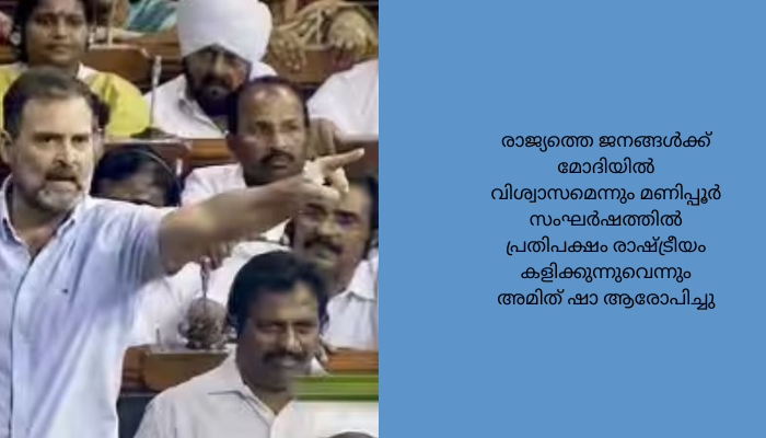 13 തവണ ശ്രമിച്ചിട്ടും പരാജയപ്പെട്ട നേതാവാണ് രാഹുൽ എന്ന് ആഭ്യന്തര മന്ത്രി അമിത് ഷാ കുറ്റപ്പെടുത്തി. രാജ്യത്തെ ജനങ്ങൾക്ക് മോദിയിൽ വിശ്വാസമെന്നും മണിപ്പൂർ സംഘർഷത്തിൽ പ്രതിപക്ഷം രാഷ്ട്രീയം കളിക്കുന്നുവെന്നും അമിത് ഷാ ആരോപിച്ചു. പ്രധാനമന്ത്രി മോദിയെ രാവണനോട് ഉപമിച്ചാണ് രാഹുൽ പ്രസംഗം അവസാനിപ്പിച്ചത്. ഏറ്റവും അവസാനം സംസാരിച്ച ആഭ്യന്തരമന്ത്രി അമിത് ഷാ തന്റെ പ്രസംഗത്തിന്റെ ആദ്യ 70 മിനിറ്റ് മണിപ്പൂർ എന്ന വാക്കുപോലും പരാമർശിച്ചില്ല.
