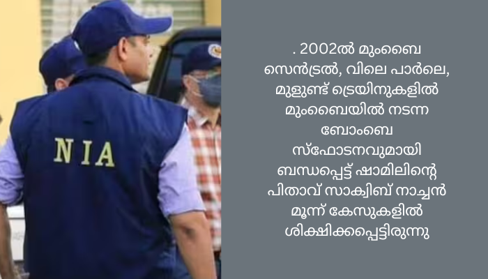 മഹാരാഷ്ട്രയിലെ താനെയിലാണ് ഷാമില്‍ താമസം. ഇദ്ദേഹം തീവ്രവാദ പ്രവര്‍ത്തനങ്ങള്‍ക്കായി ഇംപ്രൊവൈസ്ഡ് എക്‌സ്‌പ്ലോസീവ് ഉപകരണങ്ങളുടെ (ഐഇഡി) നിര്‍മാണം, പരിശീലനം, പരീക്ഷണം എന്നിവയില്‍ പങ്കാളിയാണെന്ന് കണ്ടെത്തി. 2002ല്‍ മുംബൈ സെന്‍ട്രല്‍, വിലെ പാര്‍ലെ, മുളുണ്ട് ട്രെയിനുകളില്‍ മുംബൈയില്‍ നടന്ന ബോംബെ സ്‌ഫോടനവുമായി ബന്ധപ്പെട്ട് ഷാമിലിന്റെ പിതാവ് സാക്വിബ് നാച്ചന്‍ മൂന്ന് കേസുകളില്‍ ശിക്ഷിക്കപ്പെട്ടിരുന്നു.