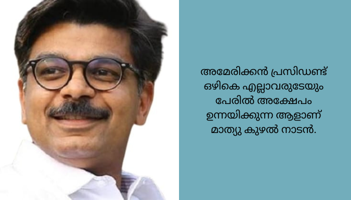 എന്നാൽ പിറ്റേ ദിവസം നൽകിയ തിരഞ്ഞെടുപ്പ് സത്യവാങ്ങ്മൂലത്തിൽ കാണിച്ച വില 3.5 കോടി രൂപയാണ്. ലക്ഷക്കണക്കിന് രൂപയുടെ സ്റ്റാമ്പ് ഡ്യൂട്ടിയും രജിസ്ട്രേഷൻ ഫീസും വെട്ടിച്ചു. ശരിയായ നിലയിലല്ലാതെ അദ്ദേഹത്തിന് പണം കിട്ടുന്നുണ്ട്.അമേരിക്കൻ പ്രസിഡണ്ട് ഒഴികെ എല്ലാവരുടേയും പേരിൽ അക്ഷേപം ഉന്നയിക്കുന്ന ആളാണ് മാത്യു കുഴൽ നാടൻ.