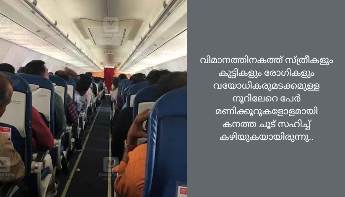 കുട്ടികൾ ചൂടും വിശപ്പും സഹിക്കാതെ കരഞ്ഞു. ആകെ ചെറിയ ബോട്ടിൽ കുടിവെള്ളം മാത്രമാണ് കൊടും ചൂടിൽ ബുദ്ധിമുട്ടുന്ന തങ്ങൾക്ക് ലഭിച്ചതെന്നും യാത്രക്കാർ പരാതിപ്പെട്ടു. വിമാനത്തിലെ ഡോർ കൃത്യമായി അടഞ്ഞില്ലെന്ന സിഗ്‌നൽ കാണുന്നതായും അതുകൊണ്ട് പൈലറ്റ് വിമാനം പറത്താൻ തയാറാവുന്നില്ലെന്നുമാണ് വൈകലിന്റെ കാരണം പറഞ്ഞത്…
