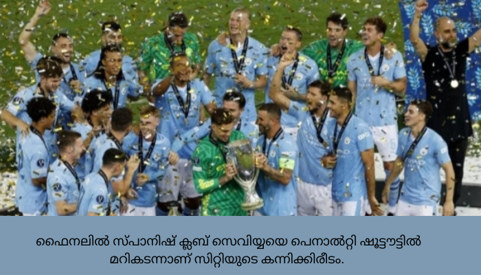 ചരിത്രത്തിലാദ്യമായി മാഞ്ചസ്റ്റർ സിറ്റിക്ക് യുവേഫ സൂപ്പർ കപ്പ്. ഫൈനലിൽ സ്പാനിഷ് ക്ലബ് സെവിയ്യയെ പെനാൽറ്റി ഷൂട്ടൗട്ടിൽ മറികടന്നാണ് സിറ്റിയുടെ കന്നിക്കിരീടം. മുഴുവൻ സമയത്ത് ഇരു ടീമുകളും 1-1 എന്ന നിലയിൽ സമനില പാലിച്ചതോടെ കളി ഷൂട്ടൗട്ടിലേക്ക് നീങ്ങുകയായിരുന്നു. സിറ്റിക്കായി കോൾ പാമറും സെവിയ്യക്കായി യൂസുഫ് എൻ നെസീരിയും ഗോൾ നേടി. ഷൂട്ടൗട്ടിൽ 5-4 എന്ന നിലയിലായിരുന്നു സിറ്റിയുടെ ജയം.