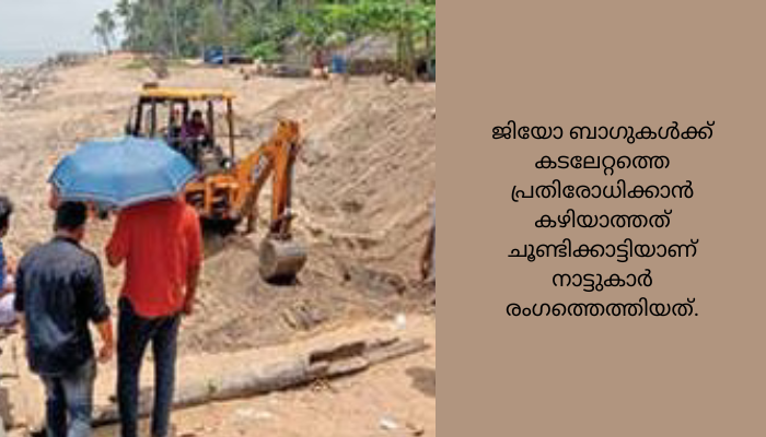 ജീലാനി നഗർ കടൽത്തീരത്ത് 16 ലക്ഷം രൂപ ചെലവിട്ട് 135 മീറ്റർ ഭാഗത്ത് ജിയോബാഗുകൾ സ്ഥാപിക്കുന്നത്. കടൽഭിത്തി നിർമിക്കുകമാത്രമാണ് കടലേറ്റം തടയുന്നതിനുള്ള മാർഗമെന്നും നാട്ടുകാർ പറഞ്ഞു. പ്രതിഷേധത്തെത്തുടർന്ന് ഉദ്യോഗസ്ഥർ സ്ഥലത്തെത്തി പണികൾ താത്കാലികമായി നിർത്തി