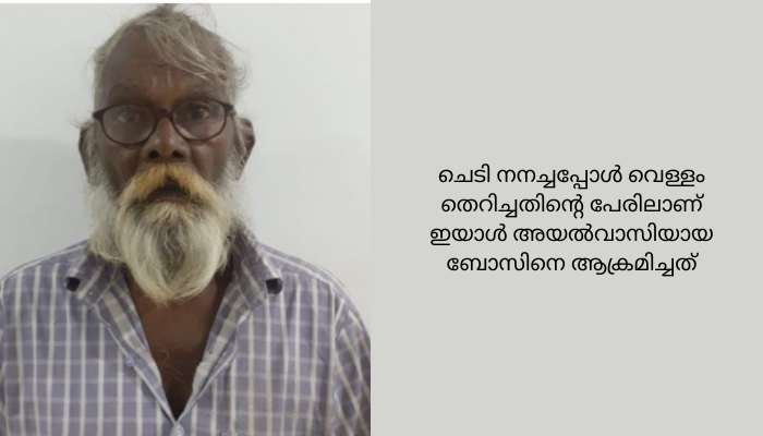 തൃശൂരില് അയല്വാസിയെ കമ്പിവടികൊണ്ട് തലയ്ക്കടിച്ച് കൊലപ്പെടുത്താന് ശ്രമിച്ചയാള് അറസ്റ്റില്. പനമുക്ക് താണിപ്പാടം കാരയില് വീട്ടില് കുട്ടനെയാണ് നെടുപുഴ പൊലീസ് അറസ്റ്റ് ചെയ്തത്.ചെടി നനച്ചപ്പോള് വെള്ളം തെറിച്ചതിന്റെ പേരിലാണ് ഇയാള് അയല്വാസിയായ ബോസിനെ ആക്രമിച്ചത്. ചൊവ്വാഴ്ച ഉച്ചതിരിഞ്ഞ് നാലോടെയായിരുന്നു സംഭവം. ബോസ് ചെടികള്ക്ക് പൈപ്പ് ഉപയോഗിച്ച് വെള്ളം നനയ്ക്കുന്നതിനിടെ വഴിയിലൂടെ നടന്നു പോവുകയായിരുന്ന കുട്ടന്റെ ദേഹത്ത് വെള്ളം തെറിച്ചു. പ്രകോപിതനായ ഇയാള് വീട്ടില് പോയി ഇരുമ്പുവടിയുമായി വന്ന് ബോസിനെ ആക്രമിക്കുകയായിരുന്നു.തലയ്ക്ക് ഗുരുതരമായി പരുക്കേറ്റ ബോസിനെ തൃശൂരിലെ സ്വകാര്യ ആശുപത്രിയില് പ്രവേശിപ്പിച്ചു. വധശ്രമത്തിന് അറസ്റ്റിലായ കുട്ടനെ കോടതി റിമാന്ഡ് ചെയ്തു. പ്രതി നേരത്തേ രണ്ട് തവണ ബോസിനേയും ഭാര്യയേയും ആക്രമിച്ചിട്ടുണ്ടെന്നു പൊലീസ് പറഞ്ഞു.