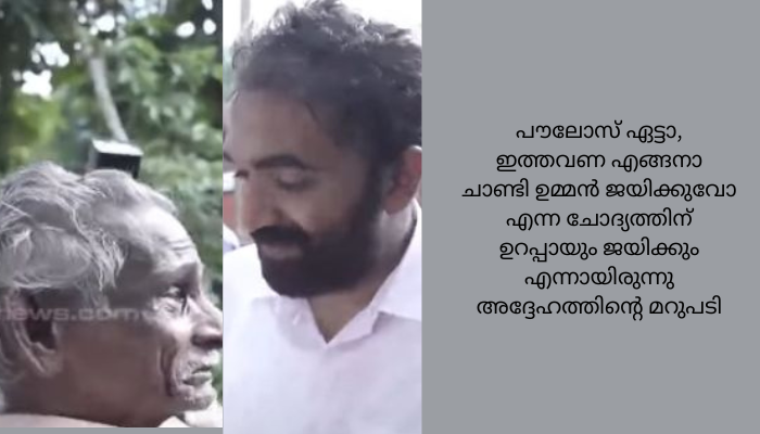 ചാണ്ടിയെ കണ്ടപ്പോൾ ഈ വിധത്തിൽ പ്രതികരിക്കാൻ എന്തായിരുന്നു കാരണമെന്ന ചോദ്യത്തിനു പൗലോസ് ഏട്ടന്റെ മറുപടി ഇങ്ങനെയായിരുന്നു. അത് എന്റെ മനസിൽ തോന്നിയ വികാരമാണ്. കുഞ്ഞൂഞ്ഞ് എന്ന് നാട്ടുകാർ വിളിക്കുന്ന ഉമ്മൻ ചാണ്ടിയുടെ വിയോ​ഗത്തെ പെട്ടെന്ന് ഒരു നിമിഷം ഓർത്ത് പോയി. അദ്ദേഹത്തിന്റെ മകൻ എന്റെ വീട്ടിൽ വോട്ട് ചോദിച്ച് വന്നല്ലോ എന്ന് ചിന്തിച്ചത് കൊണ്ടാണ് അങ്ങനെ പറഞ്ഞത്.അല്ല പൗലോസ് ഏട്ടാ, ഇത്തവണ എങ്ങനാ ചാണ്ടി ഉമ്മൻ ജയിക്കുവോ എന്ന ചോദ്യത്തിന് ഉറപ്പായും ജയിക്കും എന്നായിരുന്നു അദ്ദേഹത്തിന്റെ മറുപടി