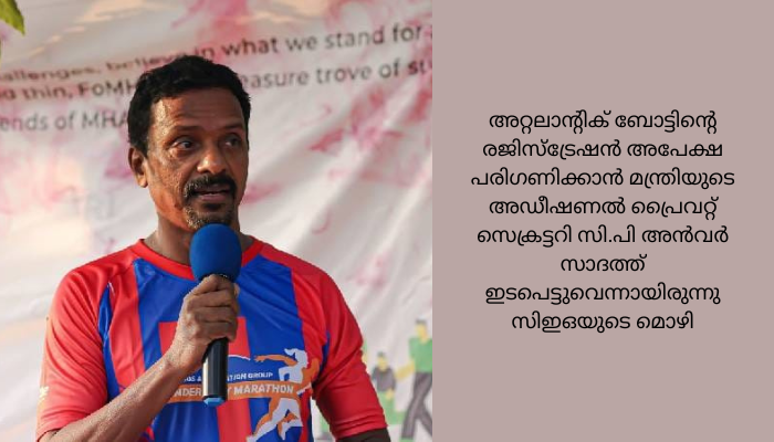 അറ്റലാന്റിക് ബോട്ടിന്റെ രജിസ്ട്രേഷൻ അപേക്ഷ പരിഗണിക്കാൻ മന്ത്രിയുടെ അഡീഷണൽ പ്രൈവറ്റ് സെക്രട്ടറി സി.പി അൻവർ സാദത്ത് ഇടപെട്ടുവെന്നായിരുന്നു സിഇഒയുടെ മൊഴി. വേണ്ട കാര്യങ്ങൾ ചെയ്യണമെന്നും നടപടികൾ വേഗത്തിലാക്കണമെന്നും മറ്റുമായിരുന്നു അൻവർ സാദത്തിന്റെ ആവശ്യം. എന്നാൽ നിയമപരമായി തന്നെ ഇത് നടക്കുമെന്നതിനാൽ ആവശ്യം പരിഗണിച്ചല്ല, നിയമത്തിന്റെ വഴിയിലൂടെ തന്നെ നീങ്ങി ഇത് ചെയ്തിരുന്നുവെന്നും മൊഴിയിൽ പറയുന്നുണ്ട്