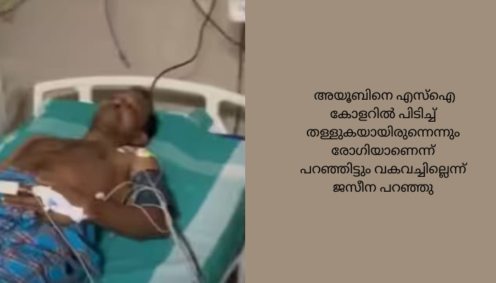 കുടുംബവഴക്കുമായി ബന്ധപ്പെട്ട കേസിൽ അന്വേഷണത്തിന്റെ ഭാഗമായാണ് അയൂബ് ഖാനെ കഴിഞ്ഞദിവസം രാത്രി പൊലീസ് സ്റ്റേഷനിലേക്ക് വിളിപ്പിച്ചത്. സ്റ്റേഷനിലെ കസേരയിൽ ഇരിക്കാൻ തുടങ്ങിയപ്പോൾ എസ്ഐ അയൂബിനെ മർദ്ദിക്കുകയായിരുന്നുവെന്ന് ഭാര്യ ജസീന പറയുന്നു. അയൂബിനെ എസ്ഐ കോളറിൽ പിടിച്ച് തള്ളുകയായിരുന്നെന്നും രോഗിയാണെന്ന് പറഞ്ഞിട്ടും വകവച്ചില്ലെന്ന് ജസീന പറഞ്ഞു. അയൂബ് സ്റ്റേഷനിൽ കുഴഞ്ഞുവീണിട്ട് പൊലീസുകാർ തിരിഞ്ഞു നോക്കിയില്ലെന്നും ആരോപണമുണ്ട്. നിലവിൽ ജനറൽ ആശുപത്രിയിലെ തീവ്രപരിചരണ വിഭാഗത്തിൽ ചികിത്സയിലാണ് അയൂബ് ഖാൻ.