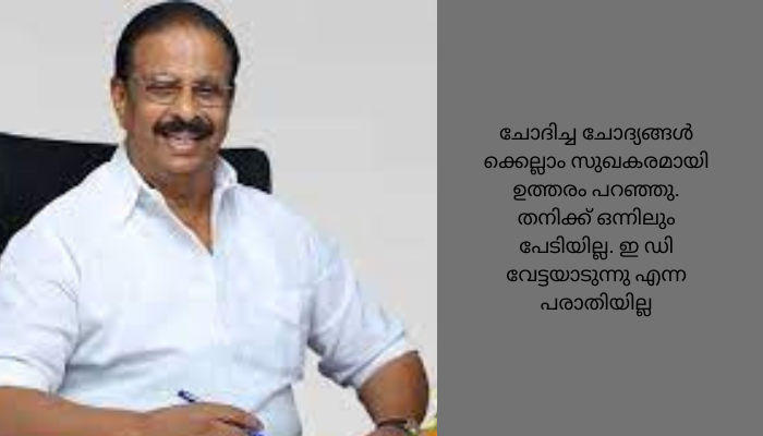 മോൻസൺ മാവുങ്കലുമായി ബന്ധപ്പെട്ട കള്ളപ്പണക്കേസിൽ കെപിസിസി പ്രസിഡന്റ് കെ. സുധാകരന്റെ ഇന്നത്തെ (22.08.2023)ചോദ്യം ചെയ്യൽ പൂർത്തിയായി. 2023 ഓഗസ്റ്റ് 30ന് വീണ്ടും ചോദ്യം ചെയ്യലിന് ഹാജരാവും എന്ന് കെ സുധാകരൻ മാധ്യമങ്ങളോട് പറഞ്ഞു.ചോദിച്ച ചോദ്യങ്ങൾ ക്കെല്ലാം സുഖകരമായി ഉത്തരം പറഞ്ഞു. തനിക്ക് ഒന്നിലും പേടിയില്ല. ഇ ഡി വേട്ടയാടുന്നു എന്ന പരാതിയില്ല, അവർ അവരുടെ ജോലി ചെയ്യുന്നു എന്നും അദ്ദേഹം പറഞ്ഞു.