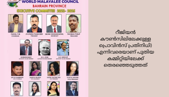 വേൾഡ് മലയാളി കൗൺസിൽ ബഹ്റൈൻ പ്രൊവിൻസിന് 2023_25 കാലഘട്ടത്തിലേക്കായി പുതിയ കമ്മിറ്റി നിലവിൽ വന്നു. എഫ്.എം.ഫൈസൽ (ചെയർമാൻ),ജ്യോതിഷ് പണിക്കർ (പ്രസിഡണ്ട്), മോനി ഒടികണ്ടത്തിൽ(സെക്രട്ടറി), തോമസ് ഫിലിപ്പ് (ട്രഷറർ) ഷൈജു കമ്പ്രത്ത് (വൈസ് ചെയർമാൻ) സന്ധ്യാരാജേഷ് (വൈസ് ചെയർപേഴ്സൺ) കാത്തു സച്ചിൻദേവ്, വിജയ ലക്ഷ്മി എന്നിവർ (വൈസ് പ്രസിഡണ്ടുമാർ) ലീബ രാജേഷ് (എൻറർ ടൈൻമെൻറ് സെക്രട്ടറി) ഡോക്ടർ രൂപ്ചന്ദ് (ഹെൽത്ത് കമ്മിറ്റി ചെയർമാൻ) ഡോക്ടർ സിത്താര ശീധരൻ ( കൾച്ചറൽ പ്രോഗ്രാം കൺവീനർ) ടോണി നെല്ലിക്കൻ (റീജിയൻ കൗൺസിലിലേക്കുള്ള പ്രൊവിൻസ് പ്രതിനിധി) എന്നിവരെയാണ് പുതിയ കമ്മിറ്റിയിലേക്ക് തെരഞ്ഞെടുത്തത്.