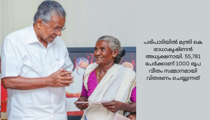 .തിരുവനന്തപുരം : 60 വയസ് മുതലുള്ള പട്ടിക വർഗക്കാർക്കുള്ള ഓണസമ്മാനം മുഖ്യമന്ത്രി പിണറായി വിജയൻ വിതരണം ചെയ്തു. മുഖ്യമന്ത്രിയുടെ ചേംബറിൽ നടന്ന പരിപാടിയിൽ മന്ത്രി കെ രാധാകൃഷ്ണൻ അധ്യക്ഷനായി. 55,781 പേർക്കാണ് 1000 രൂപ വീതം സമ്മാനമായി വിതരണം ചെയ്യുന്നത്..