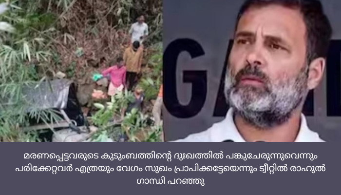 മരണപ്പെട്ടവരുടെ കുടുംബത്തിന്റെ ദുഃഖത്തിൽ പങ്കുചേരുന്നുവെന്നും പരിക്കേറ്റവർ എത്രയും വേഗം സുഖം പ്രാപിക്കട്ടേയെന്നും ട്വീറ്റിൽ രാഹുൽ ഗാന്ധി പറഞ്ഞു.ഉച്ച കഴിഞ്ഞ് 3.30 ഓടെയാണ് വയനാട് തലപ്പുഴ കണ്ണോത്ത് മലയിൽ ജീപ്പ് കൊക്കയിലേക്ക് മറിഞ്ഞ് അപകടമുണ്ടായത്. ഡ്രൈവർ അടക്കം 14 പേരാണ് ജീപ്പിലുണ്ടായിരുന്നത്. മക്കിമല എസ്റ്റേറ്റ് തൊഴിലാളികളാണ് എല്ലാവരും.